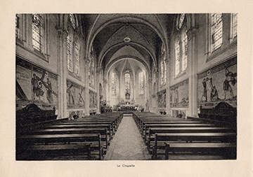 La chapelle de l’établissement est très grande, de la taille de certaines églises de villages. Dès l’entrée, l’œil est attiré par les vitraux offerts par les parents des élèves au moment de la construction.